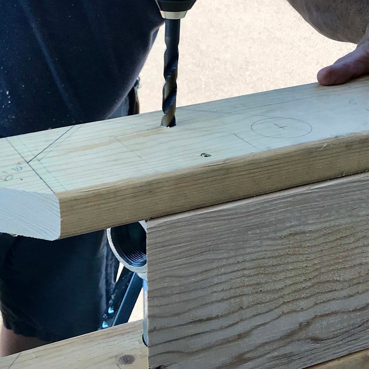 - On each rail board, drill four 1/2-in. holes at the marks you made.