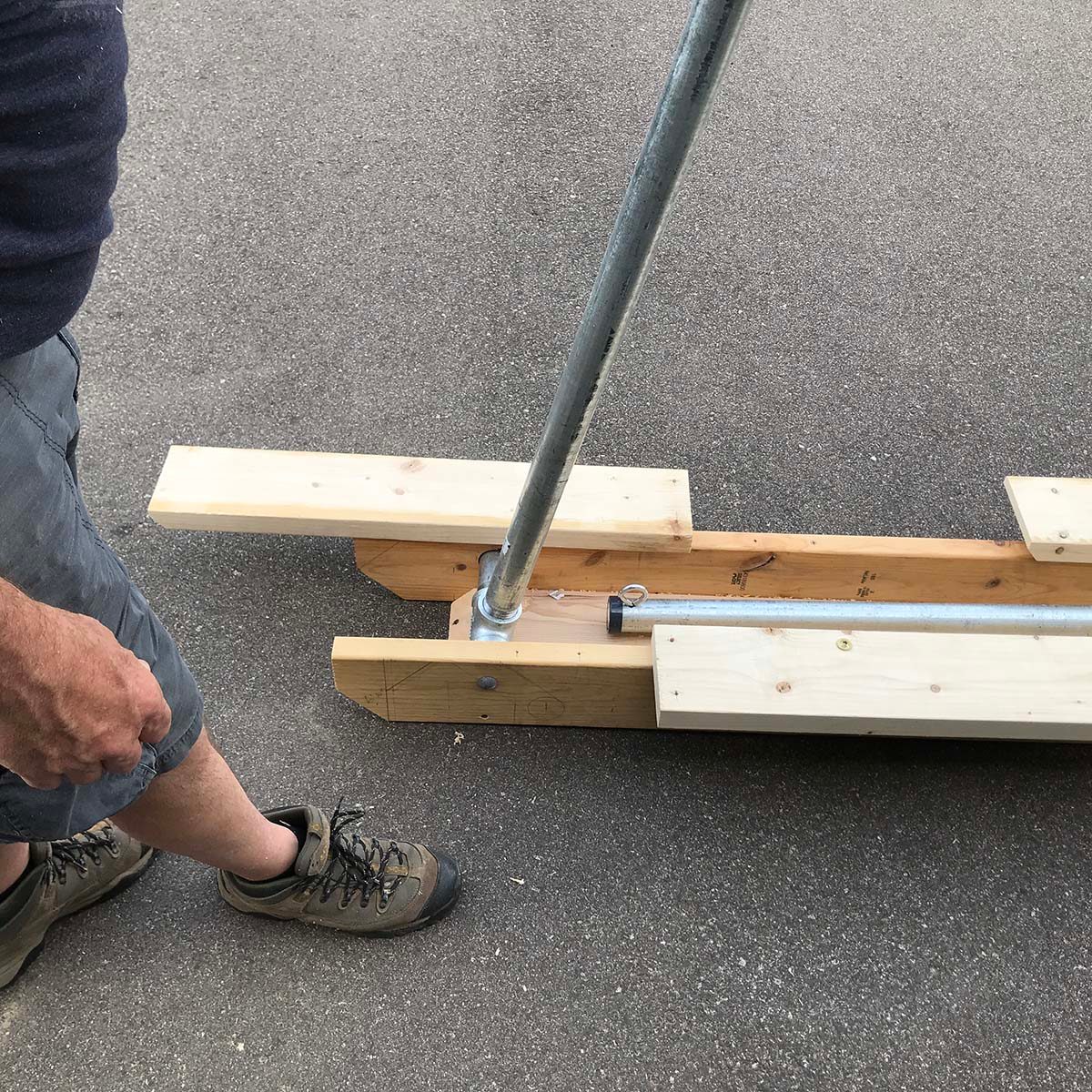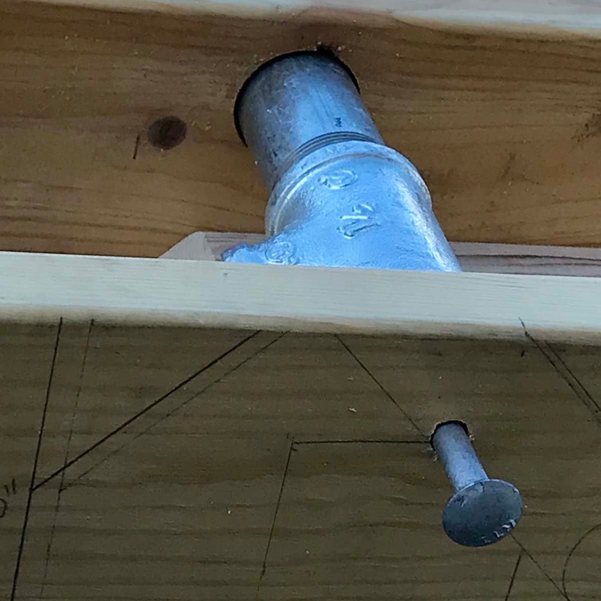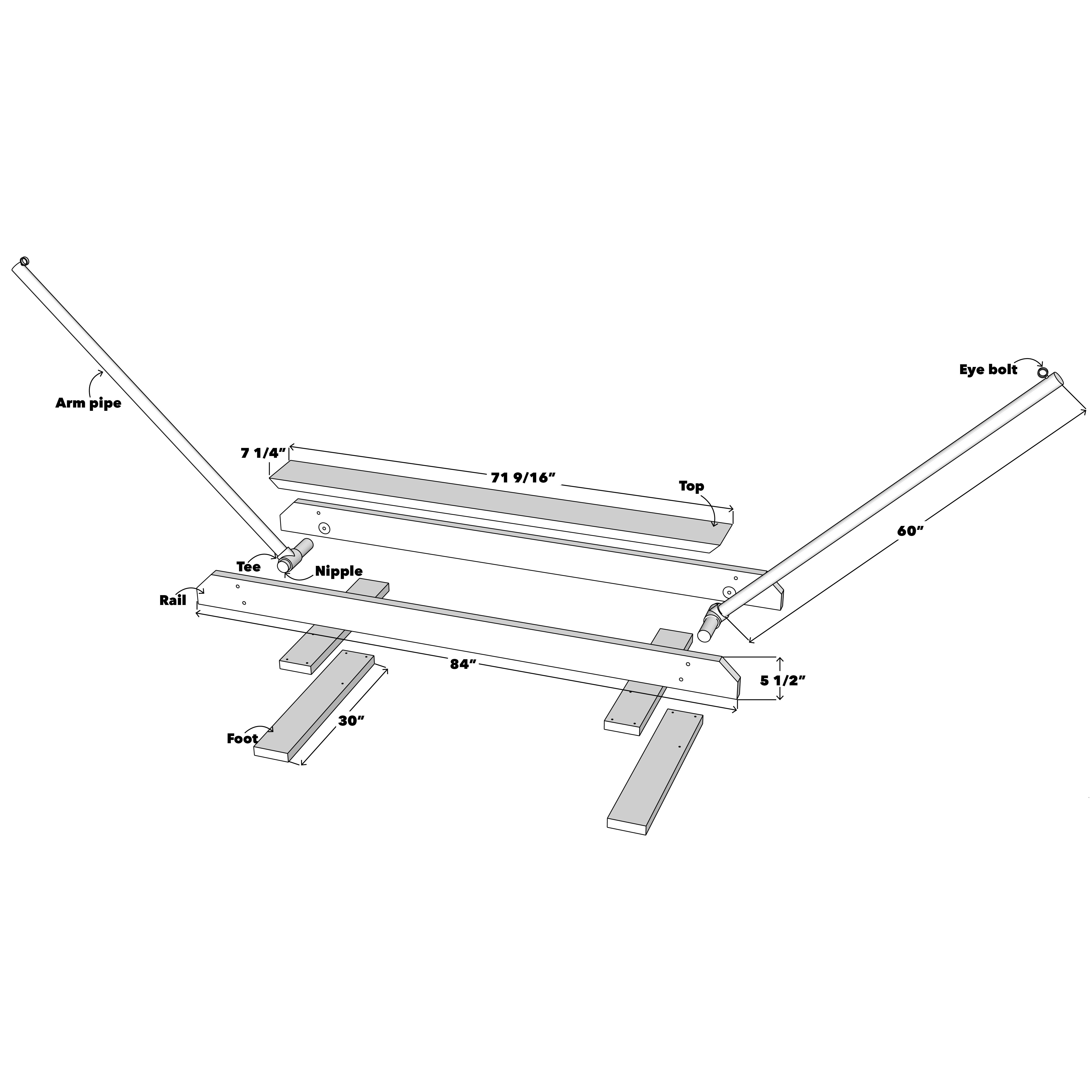 - Add a removable carriage bolt to the underside of each pipe arm through the rails to keep the pipe arms up in the air when the hammock is not attached.