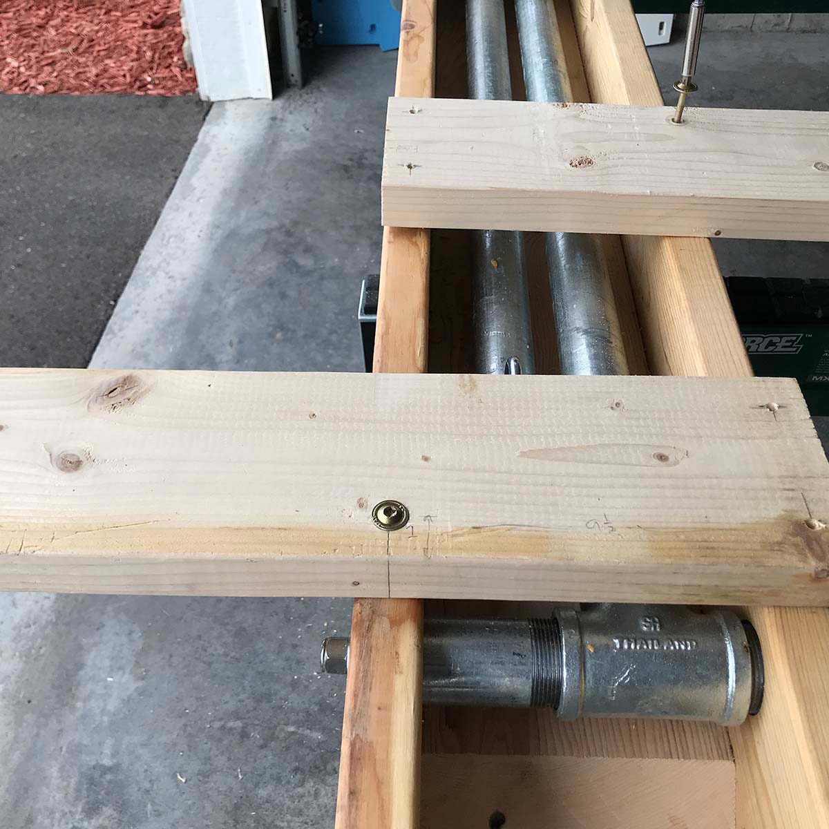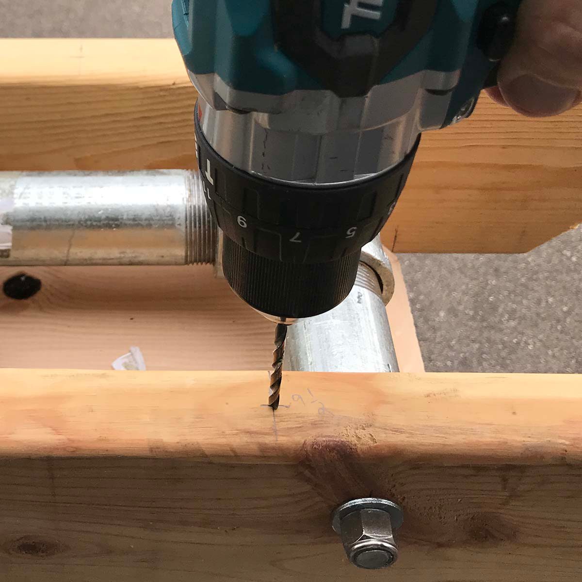- Insert four 1/2 x 12-in. carriage bolts into the 1/2-in. holes on the rail through to the other rail.