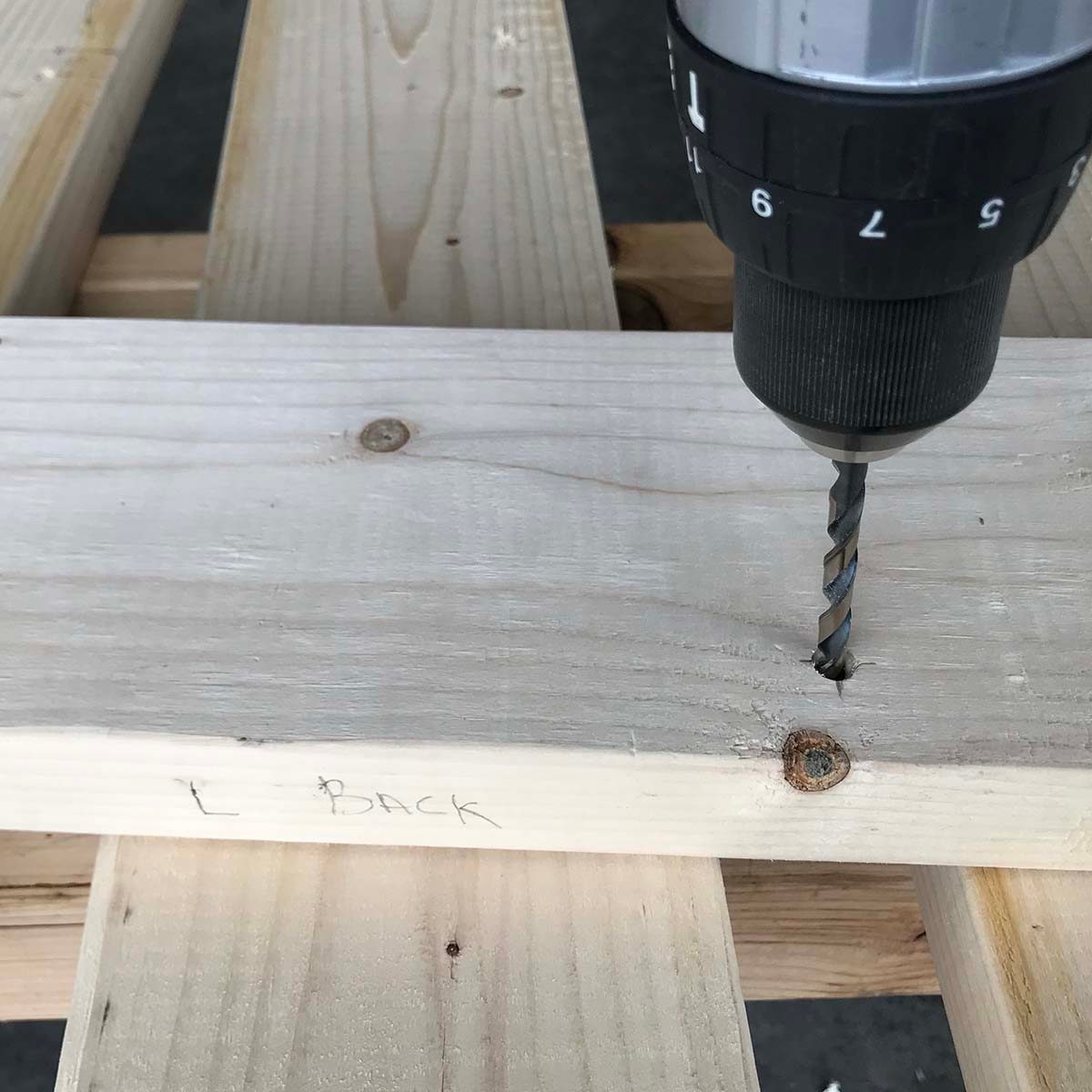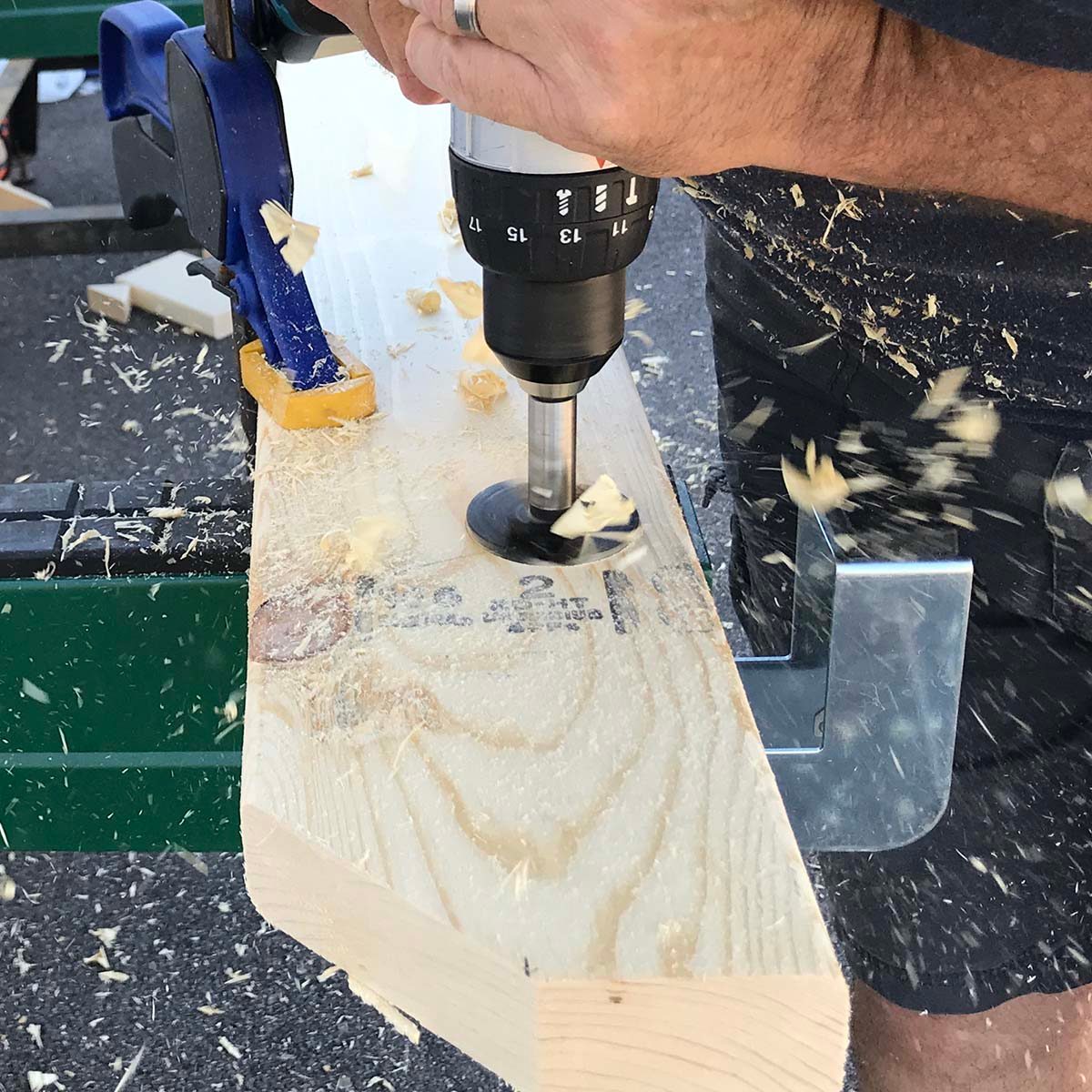 - Drill two 3/4-in. deep holes on the inside of each board at the eight-inch mark, using a two-inch Forstner bit.