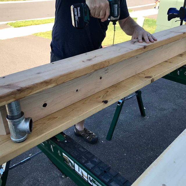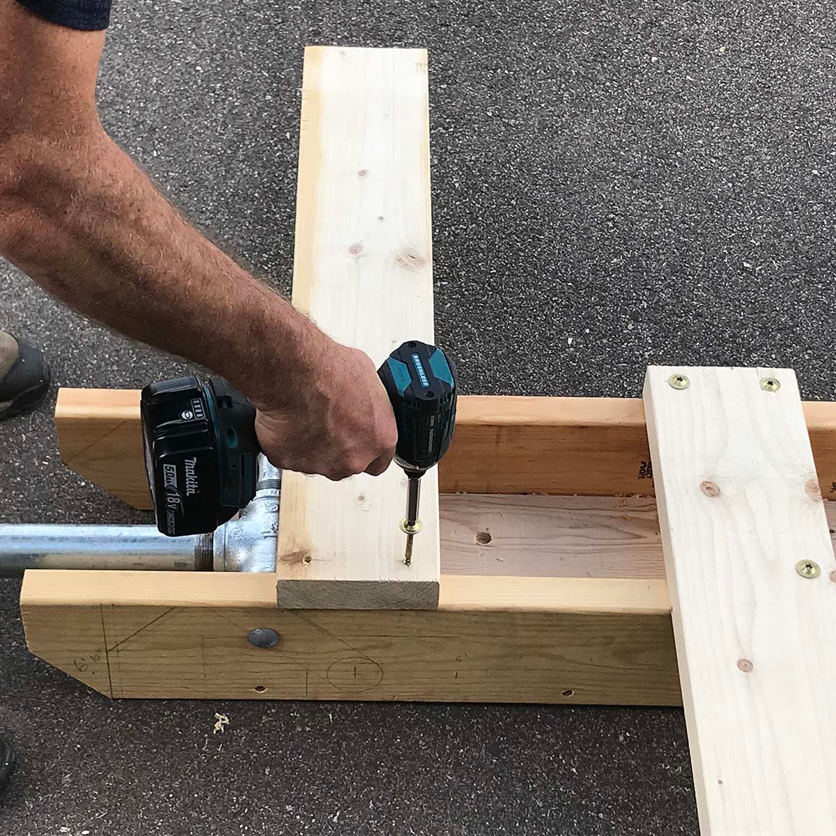- Attach all four feet to the bottom rails at the holes you drilled in step 14, using a #16 x 3-1/2-in. Power lag screws through the holes you drilled at 9-1/2-in. on the foot.