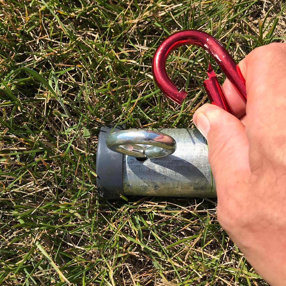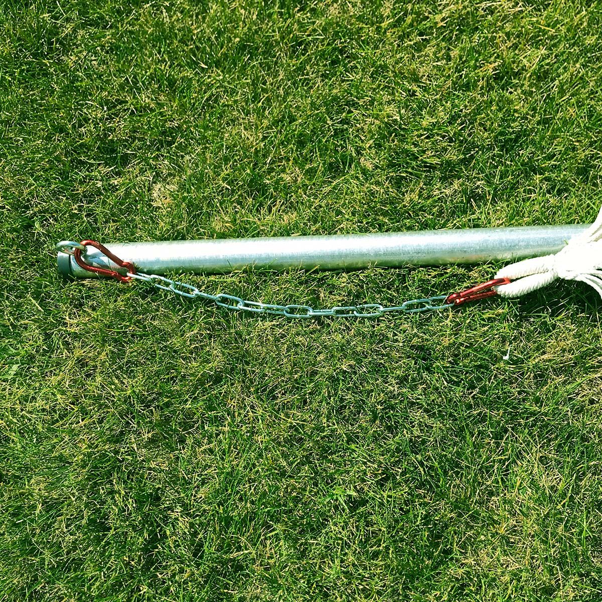 - Attach the hammock with carabiners and chain to the eye-bolts on each pipe arm.