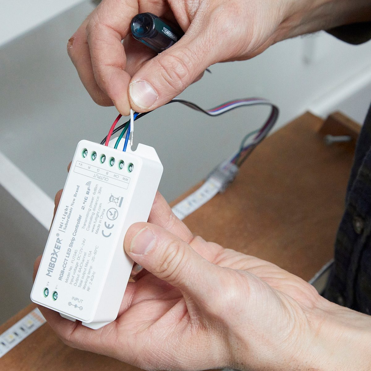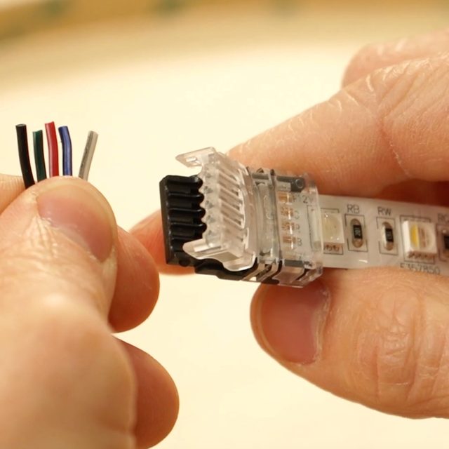 The controller gives you the ability to change the color or dim the lights. If you’re are using color-changing lights, you need a controller. Strip the colored wires and align each with the corresponding port in the controller. Tighten the screw to clamp them into place.
