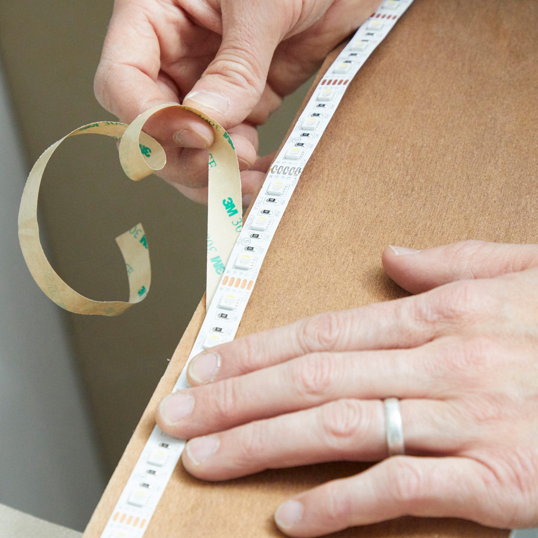 Peel away the adhesive backing and stick them wherever you need light. If the lights won’t be completely hidden, use an aluminum channel. The channel is made to accommodate different sized LED strips and comes with a frosted lens that really give this combo a finished look.