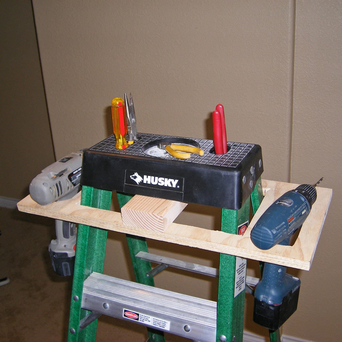When I was hanging suspended grid for ceiling tiles, I was constantly switching between two drills—one to drill pilot holes, the other to drive screws. Tired of changing back and forth and running up and down the ladder, I thought there must be a better way. I found a scrap of 3/4-in. plywood (10 in. x 24 in.) and cut an opening in it to fit over the stepladder (7 in. x 14 in.) and cutouts to hold my drill and my driver. I wedged a scrap piece of 2×4 between the ladder top and the holder to stabilize it when one tool was in use. This seat-of-the-pants solution saved me a lot of time and labor. I now use it for a variety of ladder-related tasks. — Ron Brewer