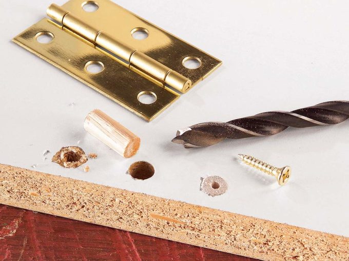 Sometimes the wood surrounding a screw becomes so torn up that it no longer holds the screw securely. Here’s a rock-solid remedy from reader Ken Rosette. Drill a 1/4-in. hole to clear the torn fibers, then glue a short piece of 1/4-in. dowel in the hole. When the glue is dry, saw or sand the dowel flush with the board surface, then drill a pilot hole in the dowel and drive in the screw.