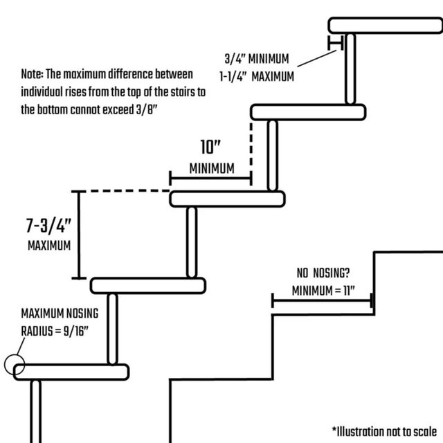 (Note: not every municipality adopts every part of every code, and some cities and states add in their own additional rules. Bottom line, check with your local building official before cutting those stringers or forming that stoop.)