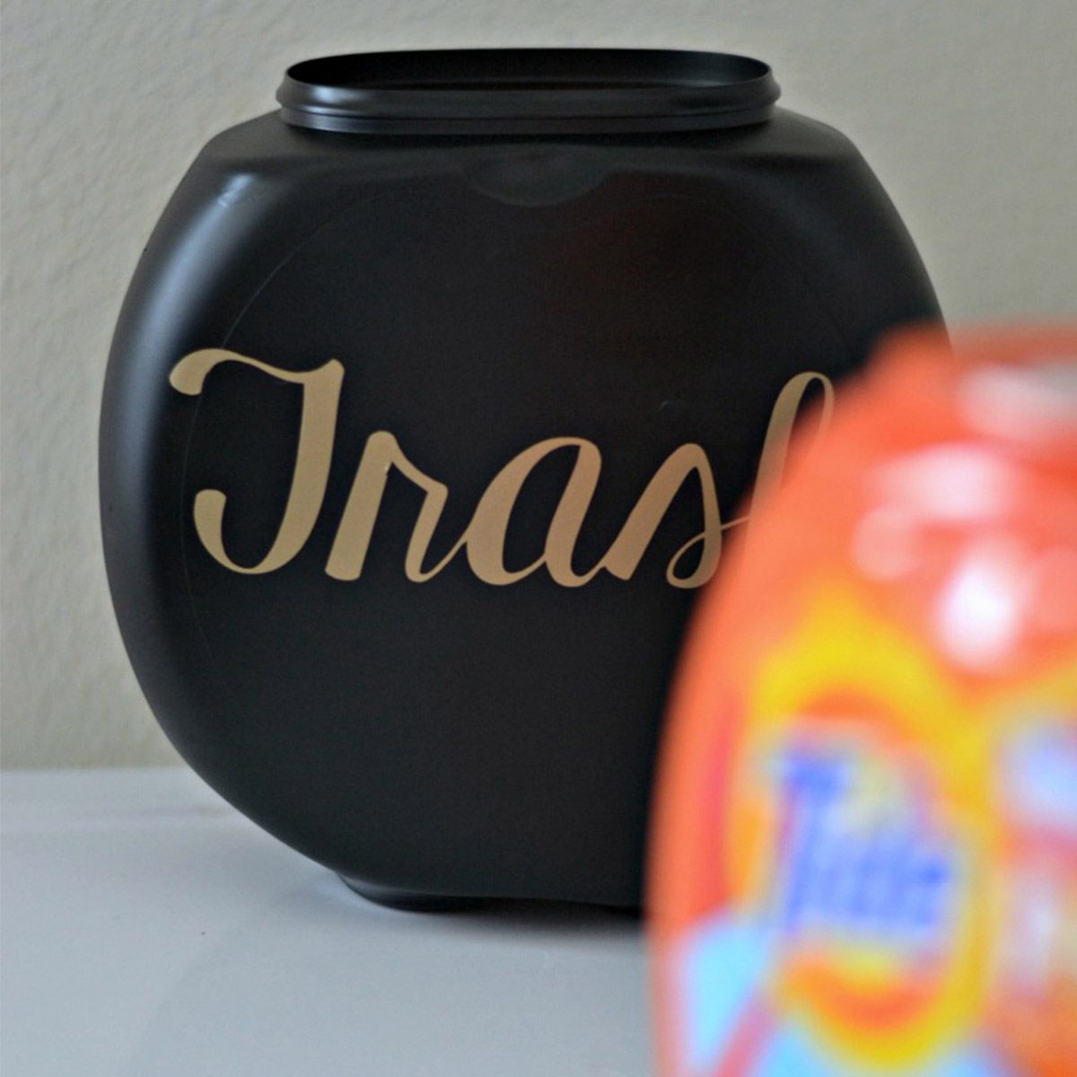 If you use detergent pods, there are lots of ways you can use the container they come in. Decide if you want the lid on or off, paint the container and label it “Trash,” “Legos,” “Plastic Bags” or whatever else needs organizing.