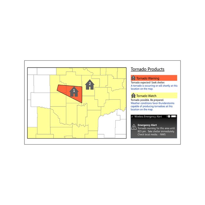 Think of a tornado watch as a call to be prepared and think of a tornado warning as a call to action. A tornado warning is issued when tornadoes are possible in and near the watch area. It’s a time to review emergency plans, check supplies and your safe room. A warning means a tornado has been spotted or shown on weather radar. It’s a time to move to an interior room on the lowest level of a building. Warnings are for specific areas, usually the size of a city or small county while watches typically cover more ground.