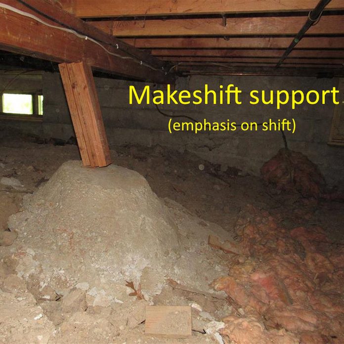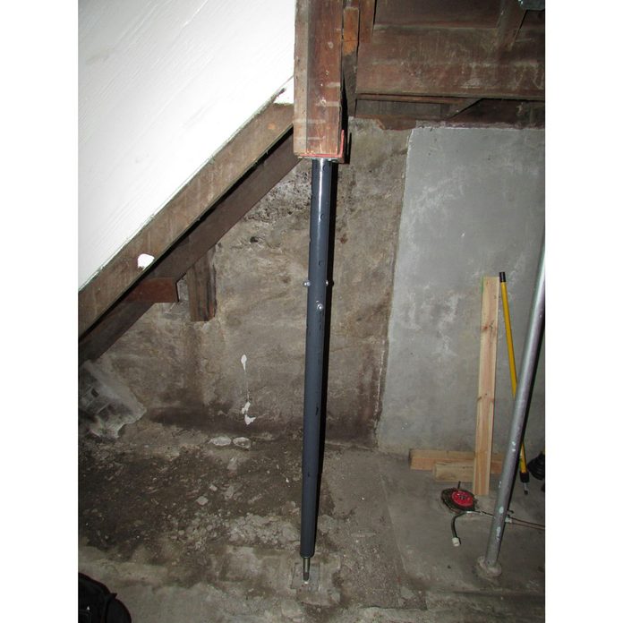 Adjustable support columns like this with steel supporting pins should only be used as temporary support columns, according to an American Society of Home Inspectors article.