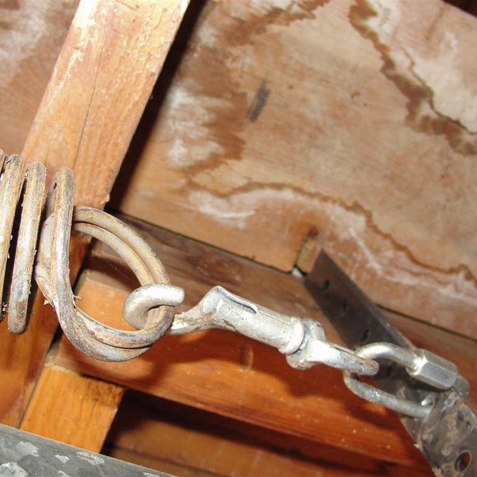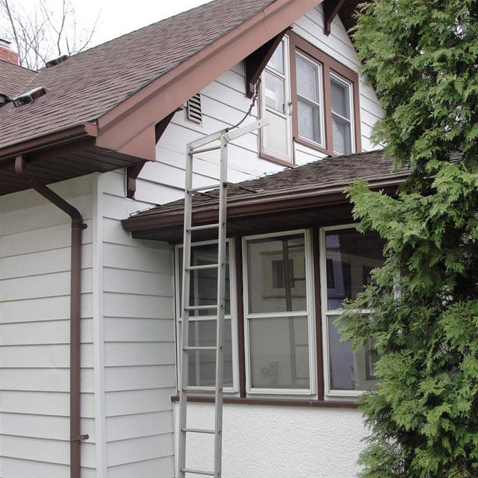 Nothing about this screams safety or viable emergency escape. It looks bolted to the roof and there’s a chain to help keep it in place. This is one of those scary things home inspectors find, like a beaver in the attic.