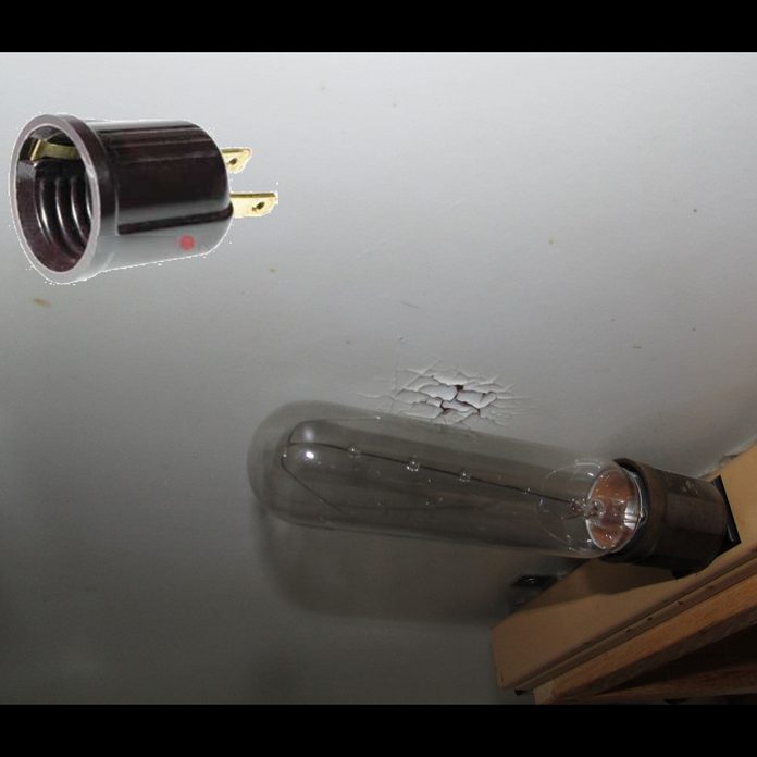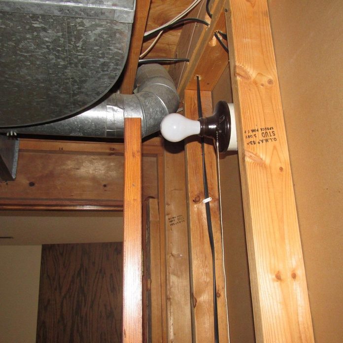 How many broken light bulbs does it take before one goes off in your head? It’s a pretty good bet that several light bulbs have been broken by this door. Can you buy them by the pallet load? In an open stud area like this, it would only take a half hour to move this electrical box to a safer place. This homeowner probably knows how to remove a light bulb broken in the socket but here’s how if you don’t know.