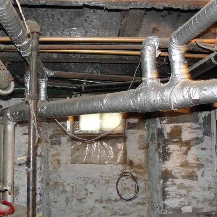 It seems as though someone tried an attempt at asbestos encapsulation by completely wrapping the pipes with duct tape. Find out how to properly dispose of hazardous items like asbestos.