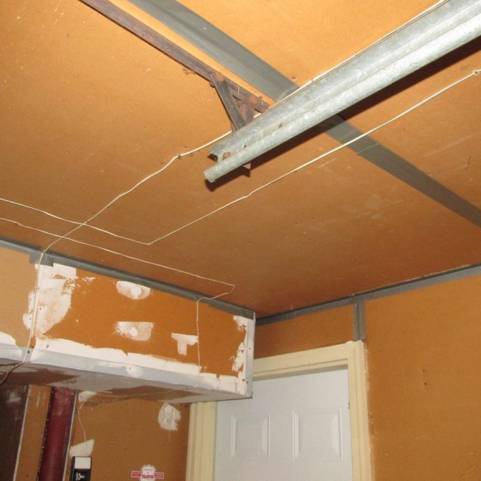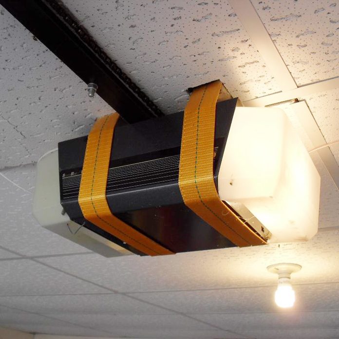 We’re guessing the ceiling framing is way above the suspended panels and there’s nothing to screw it on to. The more conventional fix would be some slotted angle iron, which can be great to get your garage organized