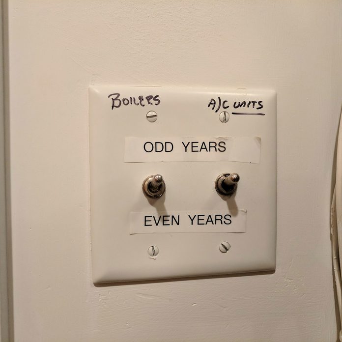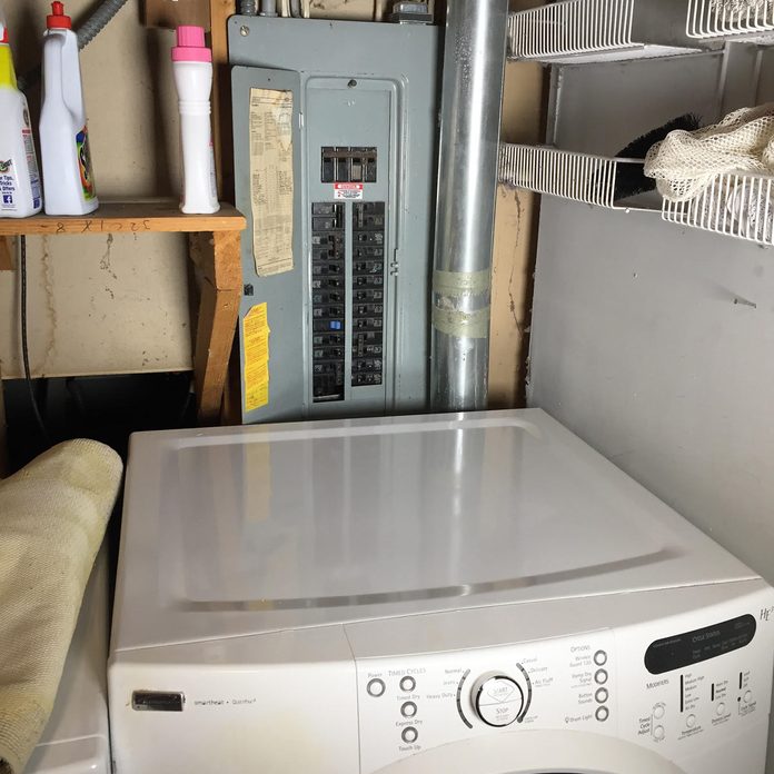 One, it’d be a terrible thing to have to reach across the dryer to the circuit breaker every time you had an issue but two there needs to be a minimum access clearance around the service panel, which this clearly doesn’t have. Knowing where the circuit breaker is in the house is essential, just like these 21 things every homeowner must know.