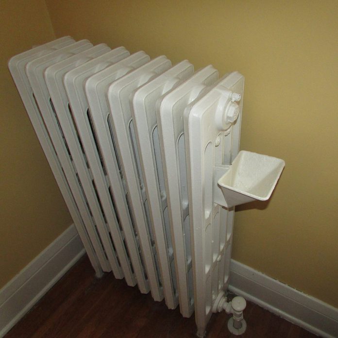 What is old is new again with this radiator humidifier. Long ago people attached humidifiers to their radiators in the winter to combat the dryness, this old radiator still has its humidifier. Make sure you know how to bleed a radiator if yours is functional. If it isn’t check out these cheeky radiator covers that will hide it.