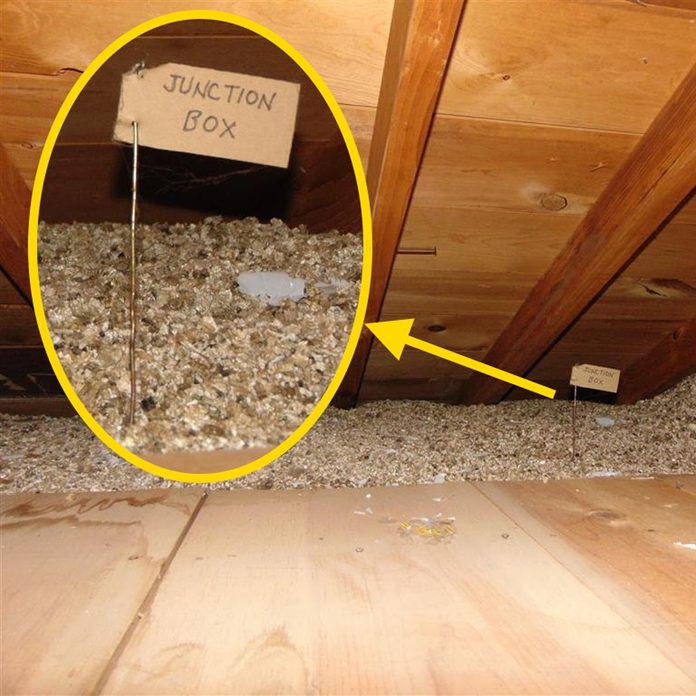 Nice to know where the junction box is located in the attic but beware. Electrical boxes should never be covered with spray foam. However they can be buried under loose-fill insulation provided the insulation can be removed to access the box. Did you know insulating an attic is one of the 12 best remodeling investments you can make?