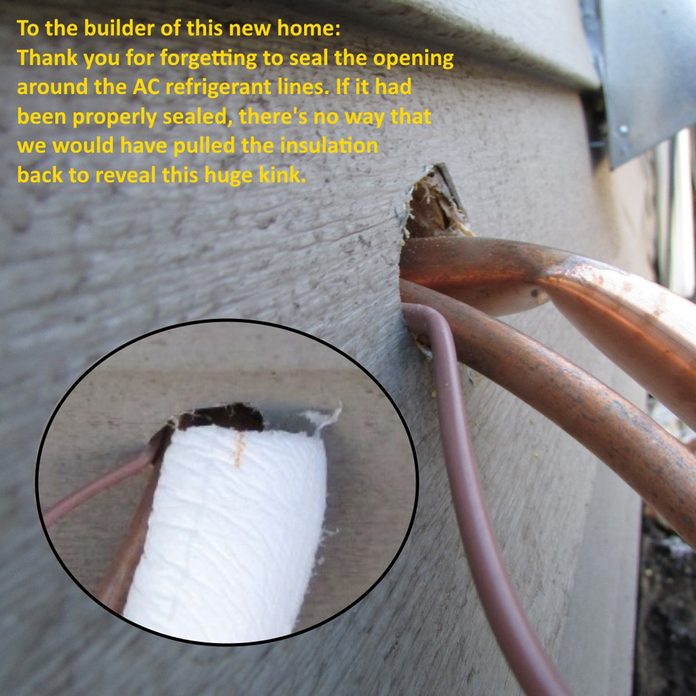 A huge kink in an A/C refrigerant line is the start of a big problem eventually. Not only did the installer create the kink, he hid it behind the insulation rather than fixing it. Plus the line needs to be sealed with putty to keep out critters. Follow these 21 ideas to keep your AC running.