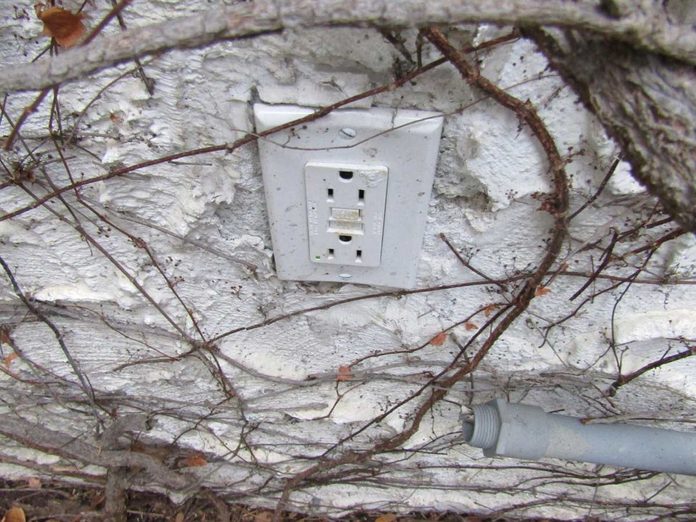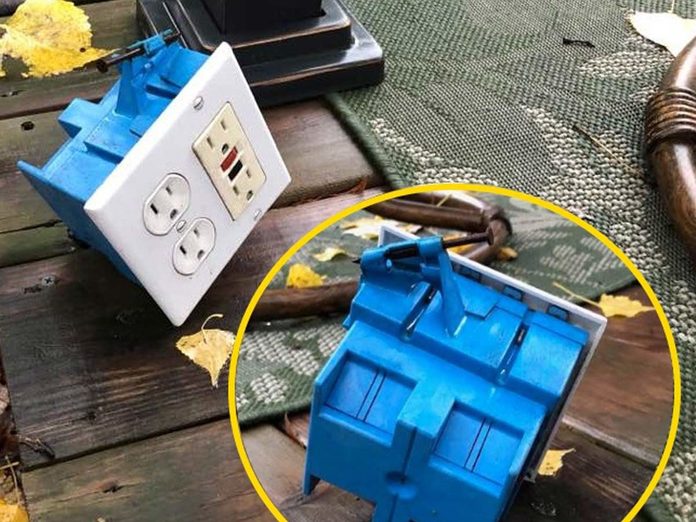 There is so much wrong with this deck outlet. Here’s the proper way to add an outdoor electrical box.