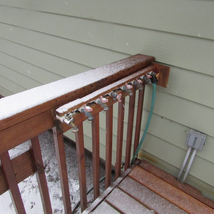 Water your planters all at once with this little contraption. But notice the snow? It’s likely the start of winter. That hose should be removed at both ends and the faucets need to be opened so they can drain. Otherwise burst pipes will be discovered at the first thaw. Make sure you know the things you need to do when a pipe bursts.