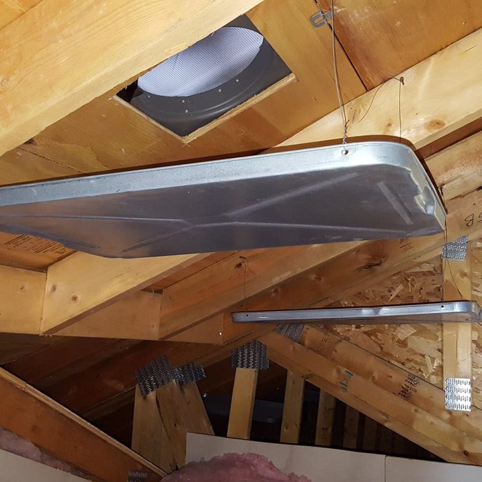 This looks like an elaborate way to capture rain that gets blown into the attic. But that shouldn’t happen with a attic roof vent. Here’s how to reduce cooling bills and prevent ice dams from forming with some attic venting tips.