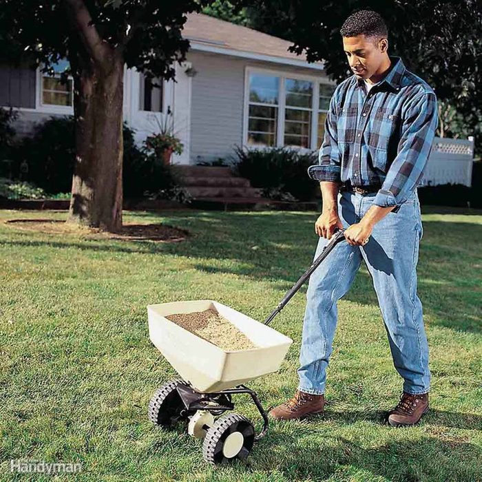 Broadcast spreaders do a great job of spreading grass seed, fertilizer and weed killer on larger lawns because they throw the material out more consistently over a wide area. However, unless you know how much area they cover for each type of product, you can end up spreading too much or too little and get bad results. The best way to find out the actual dispersal pattern for your broadcast spreader is to do a test run on your driveway and then measure the results. Clean off a 12 x 20-ft. section of the driveway. Close the flow lever on your spreader and set the controls for the product you’re using. Fill the spreader—do this on the driveway or sidewalk to avoid spills on the grass—then open the flow lever and push the spreader several feet down the center of the driveway at your normal pace, continuing for a few steps after you close the hopper. Measure the average dispersal pattern to the sides and front.