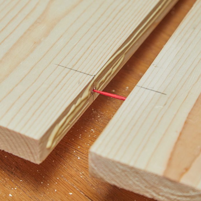 Round toothpicks work great for joining boards. When the boards are cut and ready to assemble, drill pilot holes (the same diameter as the toothpick) in two corresponding spots on each board. The pilot holes must be in the exact same spot on each board, so it’s smart to use a square when measuring. Next, apply glue to the toothpick and tap it into the hole. When the glue sets, cut the toothpick to the right length to fit into the other board. Then add glue to the toothpick and the board edges and join the boards. Clamp to dry. You’ll have a nearly invisible fastening job.