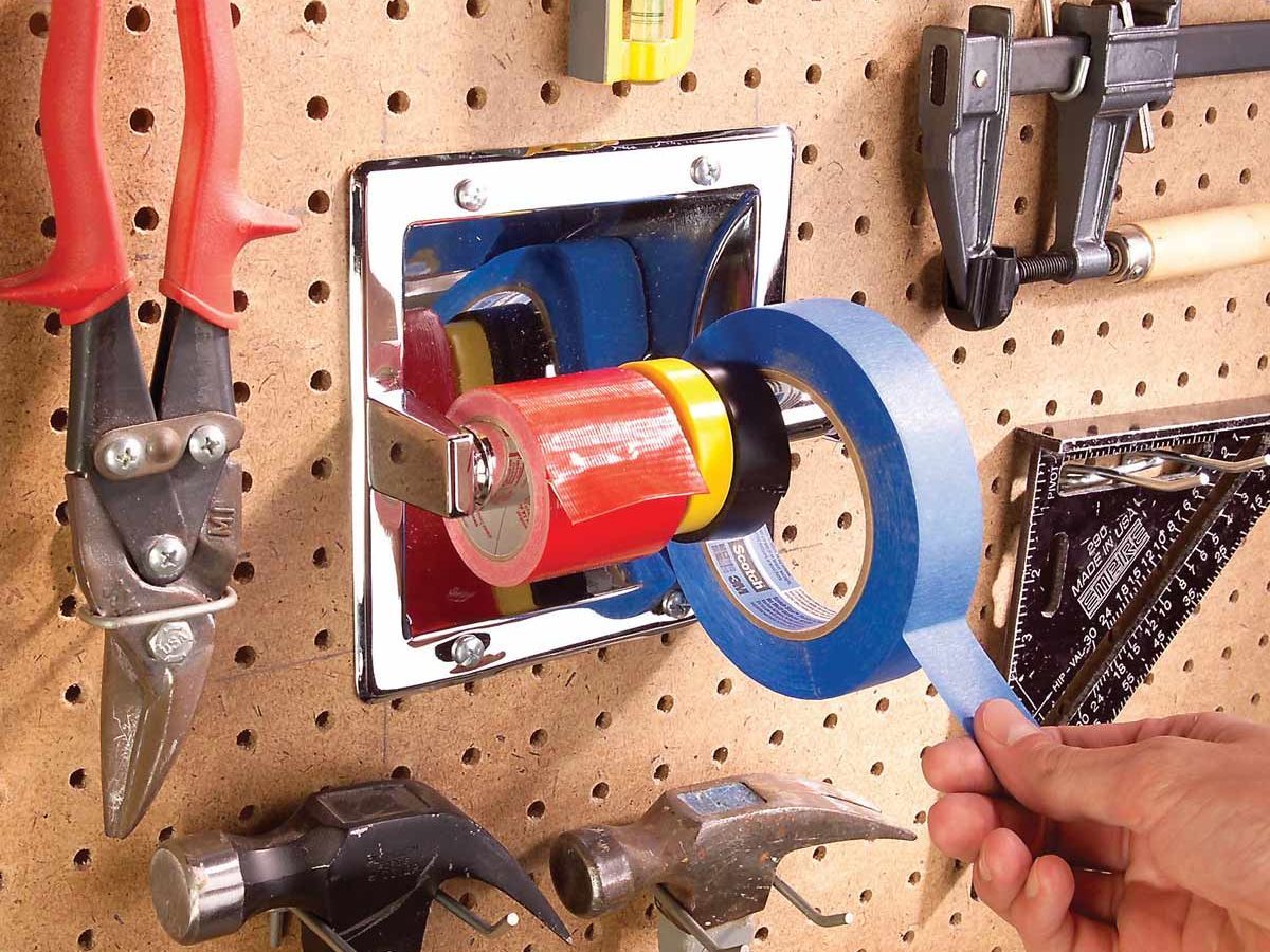 Every workshop needs close-at-hand rolls of tape, such as transparent tape beside crafting tables, painter’s tape for paint or stain projects and duct tape (for everything else!). Here’s a dispenser that uses a toilet paper holder, which is essentially just a small tension rod, between the holder arms. Just scale up the build to a full-size tension rod and you’ll be able to hold an assortment of types and sizes of tape.