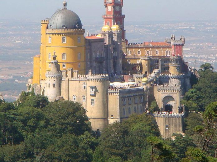 On a hill in the Sintra Mountains in Portugal, Pena Palace stands out. Construction on the castle started in the Middle Ages and is on the UNESCO World Heritage Site list.