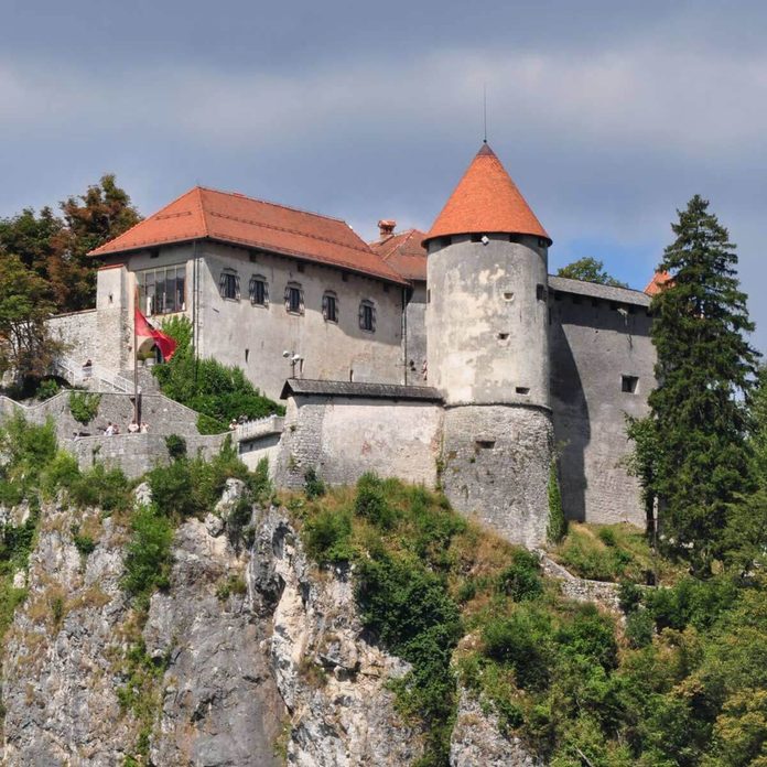 Bled Castle in Bled, Slovenia overlooks Lake Bled from high and has stood there since perhaps as early as 1011. It rises up from the landscape of mountains and trees.