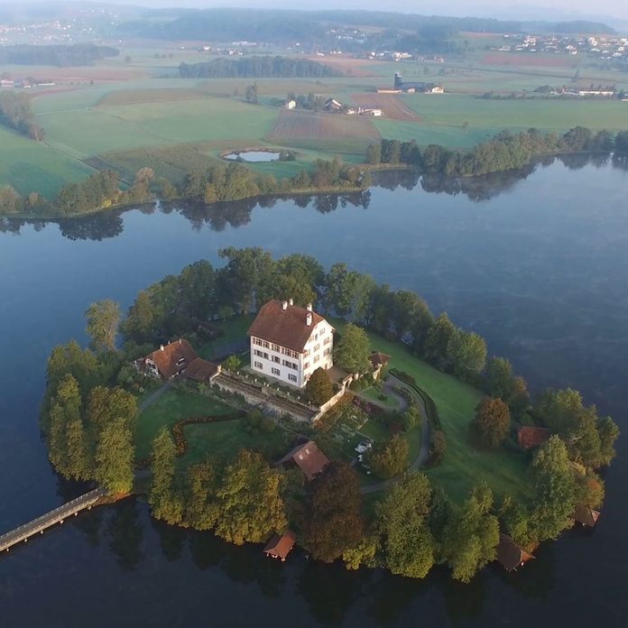 The owner of this 12th century island estate discovered it during a training exercise with the Swiss Army and decided it’d be the perfect place for him and his family. In 1998 he purchased it and began restoring it. It’s notorious difficult to see as the path around the island to see it is often overgrown with vegetation and only a small wooden bridge serves as the entry point.