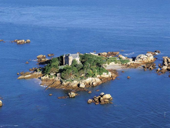 The island of Costaeres is located in Brittany, France and is a private island that is available to rent. It was built in 1855 and provides a tremendous view of the pink granite along the Brittany coast.