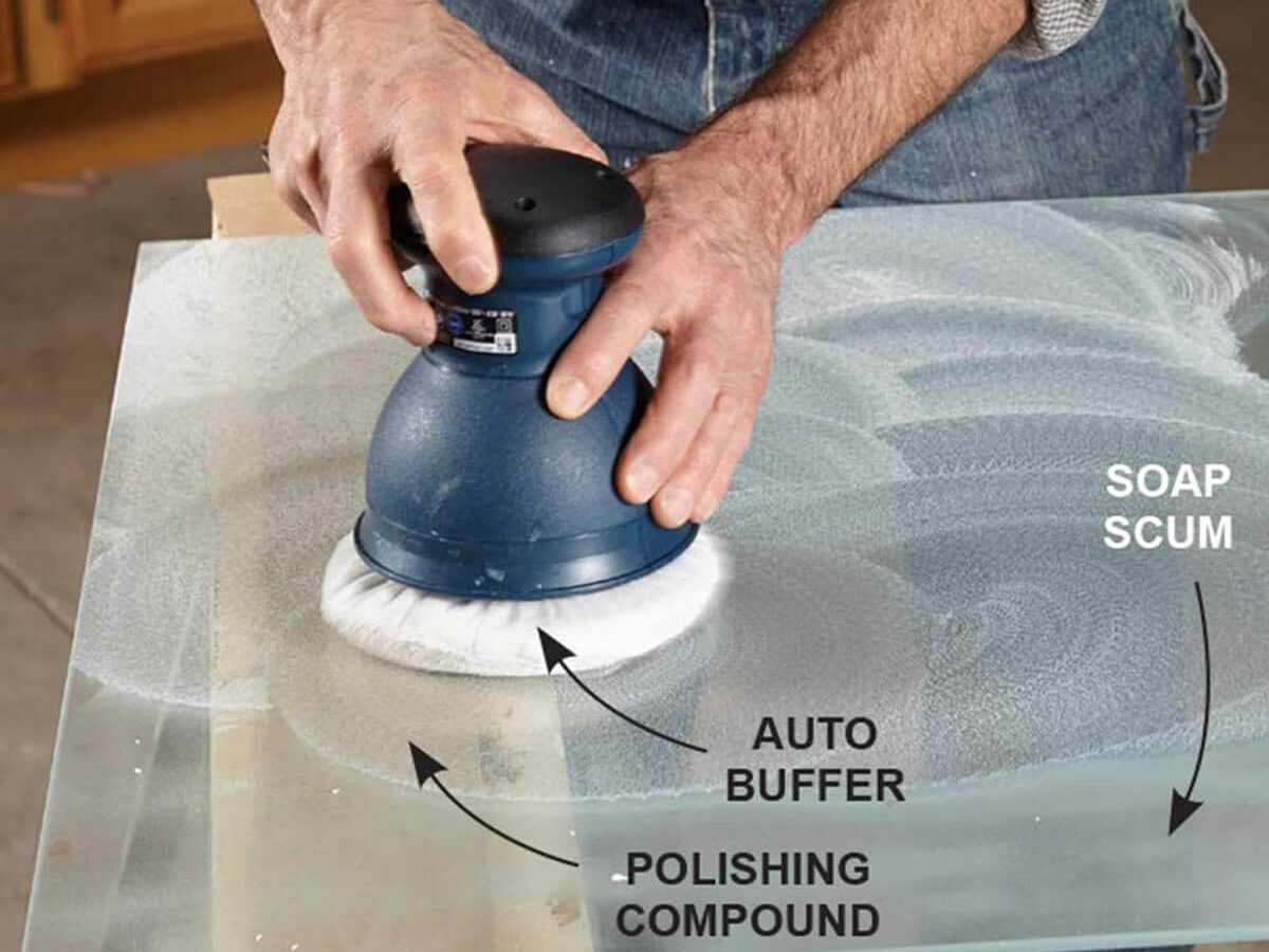 Pick up some polishing compound at a home center or an auto parts store and use an auto buffer to polish off the offending scum. If you don’t own a buffer, you can buy one for as little as $20 or borrow one from a gearhead friend. If possible, remove the doors and take them out to the garage to avoid messing up the bathroom.