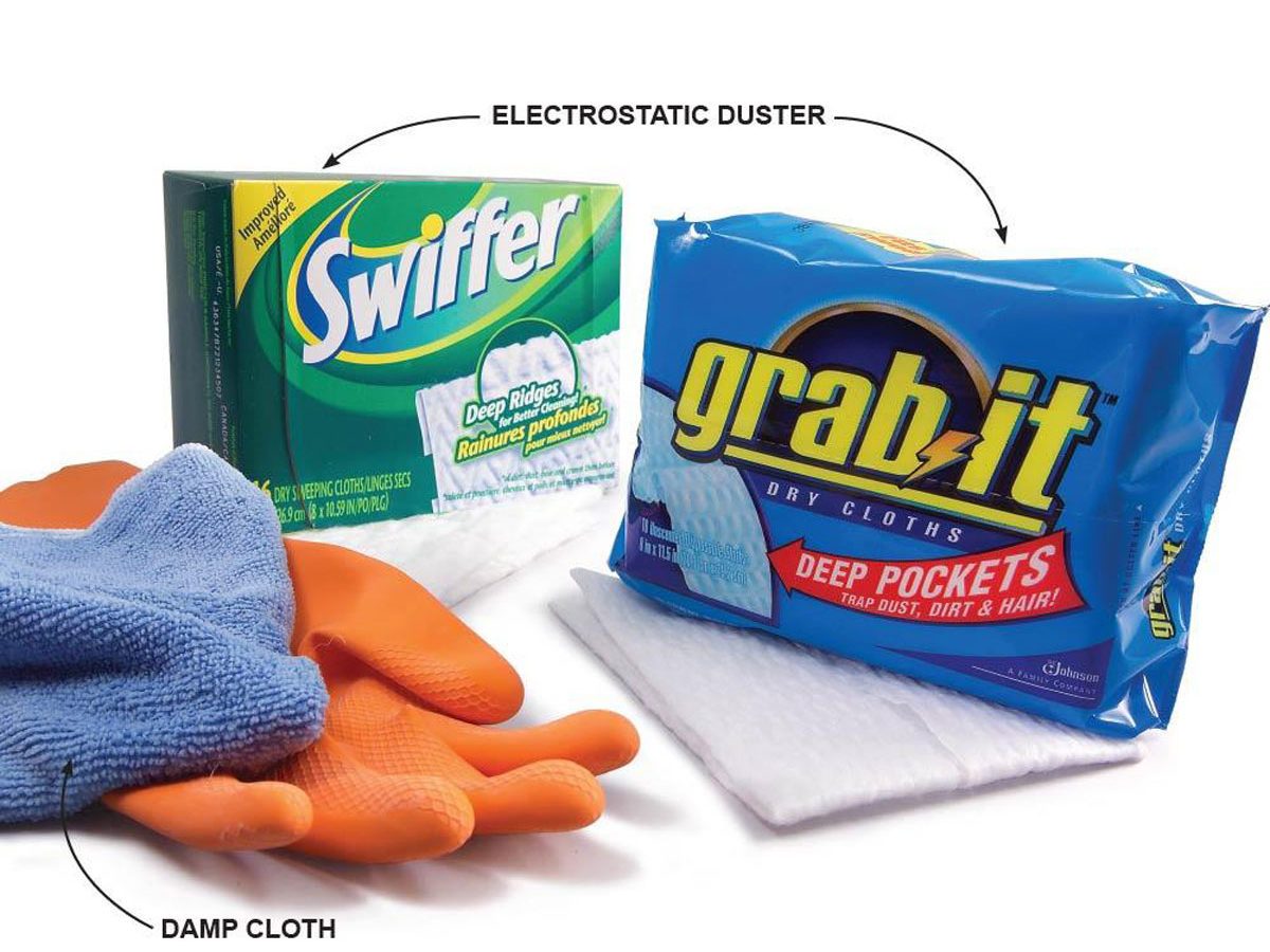 Feather dusters and dry rags pick up some of the dust they disturb, but most of it just settles elsewhere. Damp rags or disposable cloths that attract and hold dust with an electrostatic charge (like Swiffer or Grab-it) work much better. Cloths that attract dust with oils or waxes also work well but can leave residue on furniture.