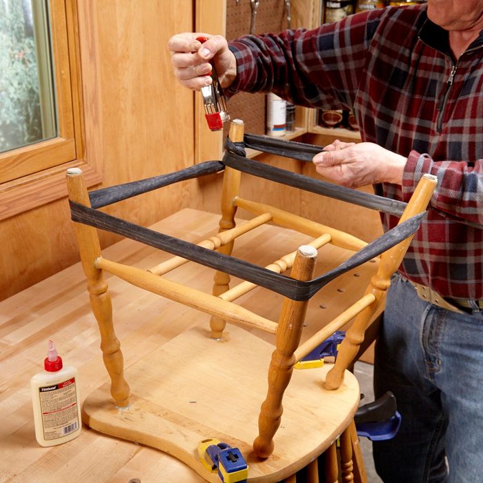 Old bicycle inner tubes work great for clamping odd-shaped projects. I used them recently to hold the rungs secure in a set of chairs I glued up. Just knot the tube to the right size and then stretch it over. Set the chair on a flat surface as the glue dries. The tubes can handle jobs that conventional clamps just can’t. — Allen J. Muldoon