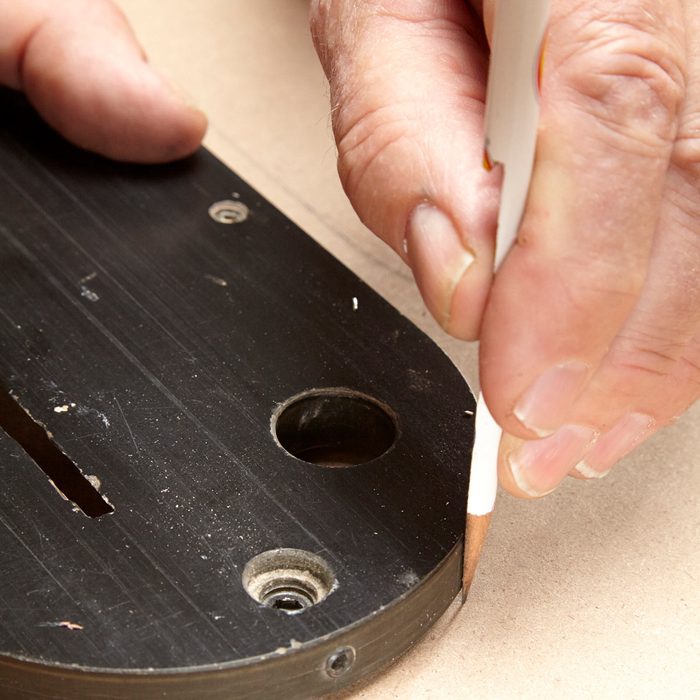 While trying to trace an exact copy of the throat plate for my table saw, I came up with this nifty technique using an ordinary pencil. I just shaved my pencil into a half-pencil by carefully grinding it on my belt sander. The flat edge enables my modified pencil to ride straight up along the edge of the template. It also works great for marking and then shaping inlays for my woodworking projects. — Tim Reese.