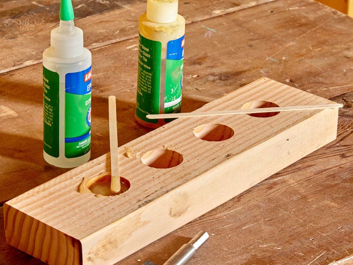 Here’s a nifty tip—with a nifty tip—from faithful reader Don Ayers: Fill snap-capped sports water bottles with glue and stick them upside down in a hunk of 2×6. Now you don’t have to wait for the glue to run into the neck of the bottle, and the cap will control glue flow (and never get lost). To holster the glue dispensers, cut holes in the base with a spade bit that’s a smidgen larger than the cap’s diameter.