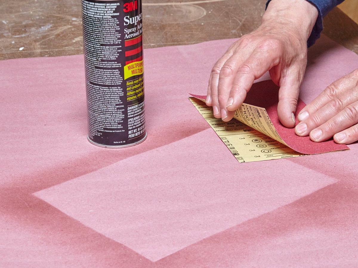 Whenever I use sandpaper sheets that are folded in half, the sandpaper slides on itself as I sand. To solve the problem, I just spray a light coat of contact adhesive on the back of the sheet. Once it has air-dried for a couple minutes, I fold the sheet in half for a permanent bond. Works like a charm. — Brian Flynn.