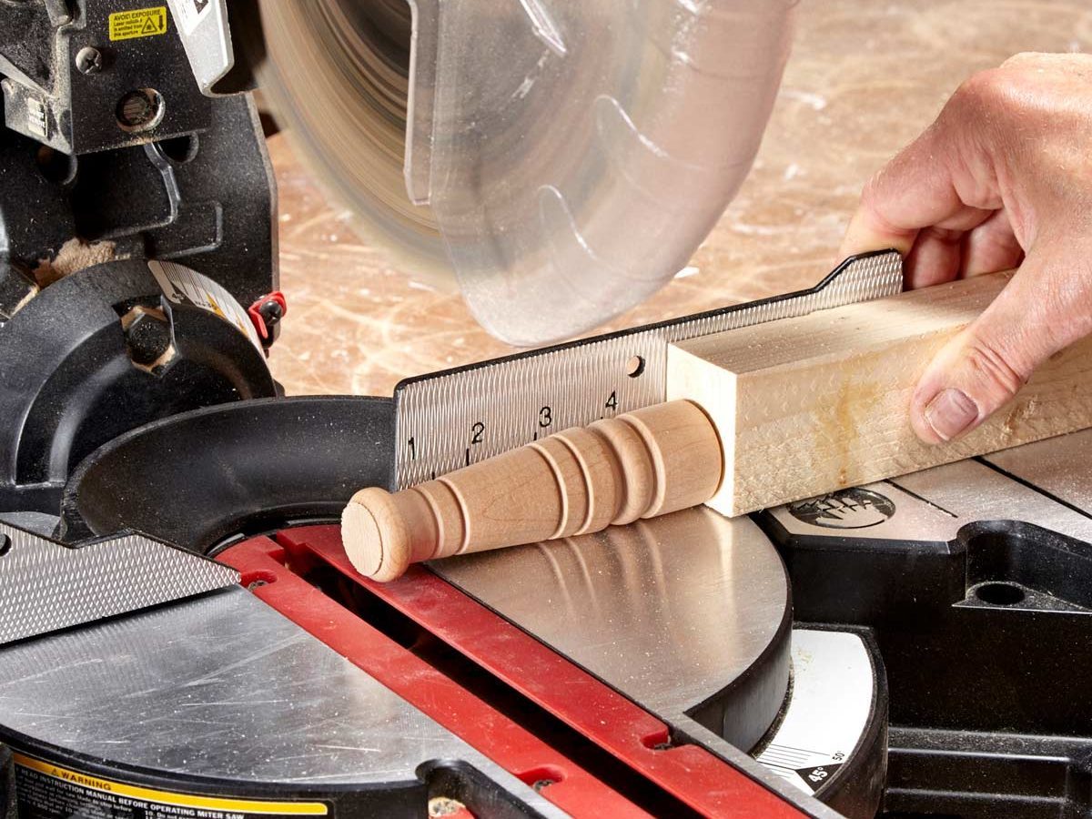 Recently I needed to cut some small furniture legs on my miter saw. With their irregular shape, they were impossible to hold safely, so I attached each leg to a scrap 2×2 with a dowel screw. These assemblies stayed straight and kept my hands far from the blade. — David Alexander.