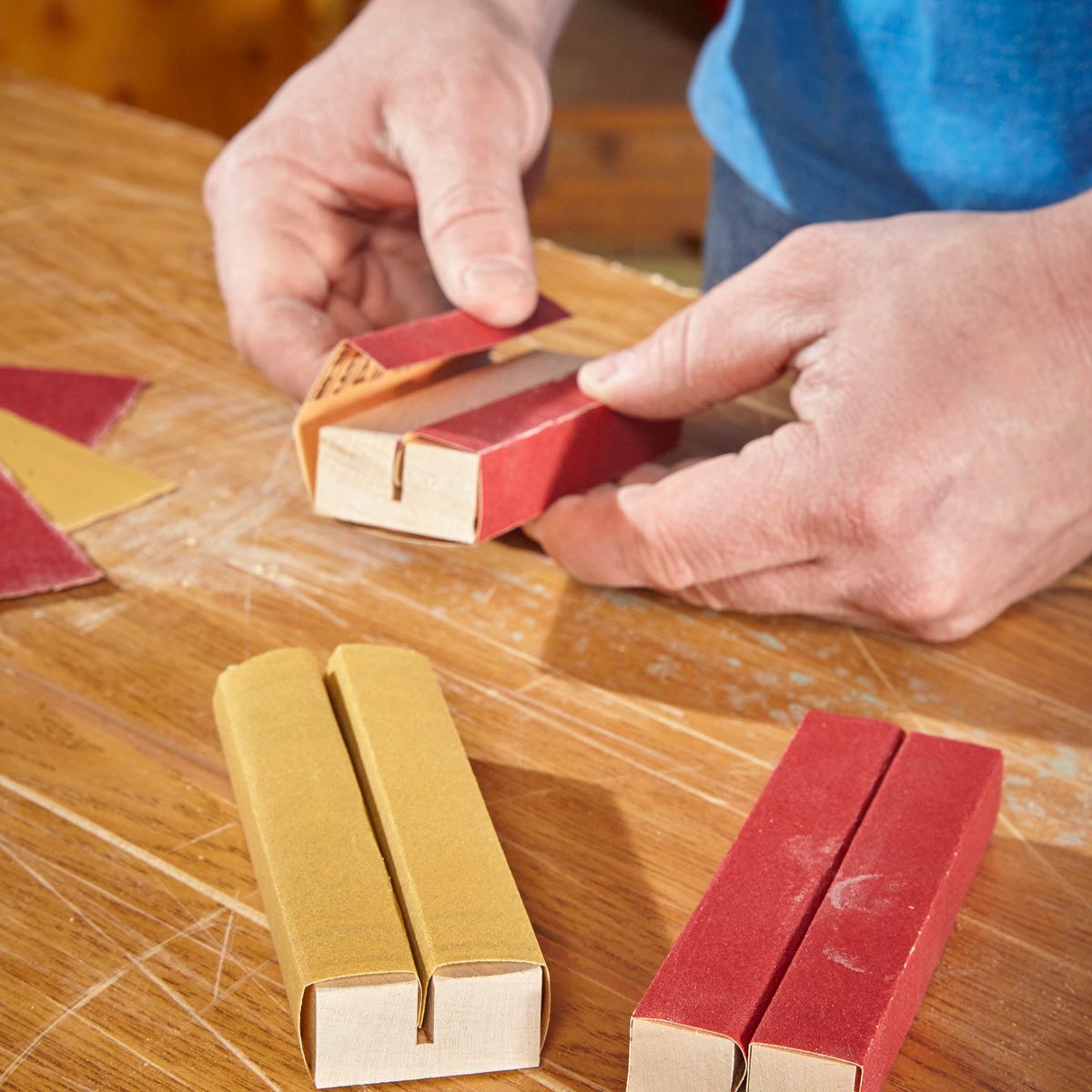 Not happy with the selection of sanding blocks at the hardware store, I made a few of my own from hardwood scraps left over from a woodworking project. I cut each one to 3/4 in. x 1-1/2 in. x 4-1/2 in.—which is just the right size to wrap a quarter sheet of sandpaper around. And the “kerf” cut helps hold the sandpaper in place until I’m ready to change it. —Tim Olaerts.