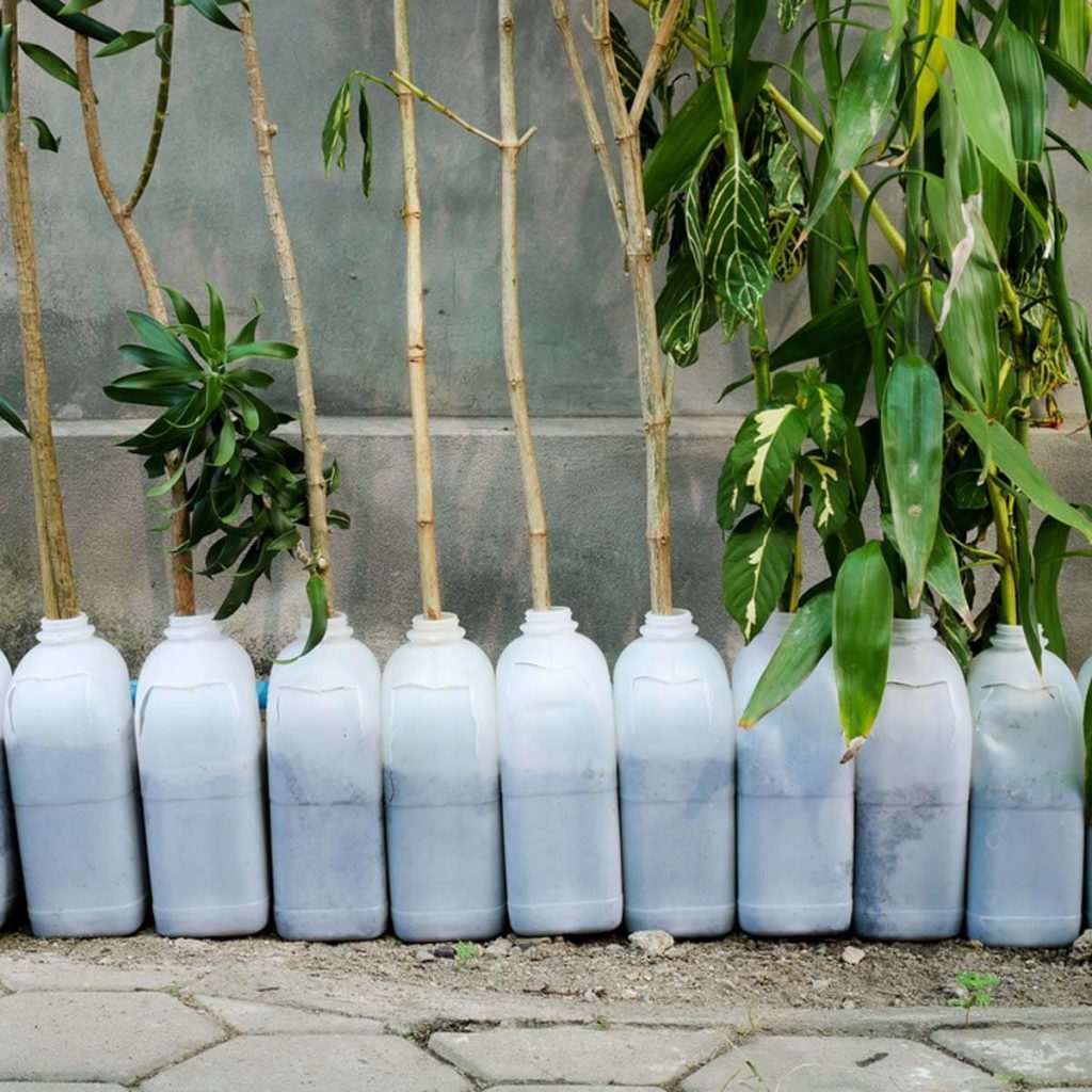 Those plastic milk jugs can be cut and used as planters. Try hanging them from a fence with wire coat hangers, as shown here.