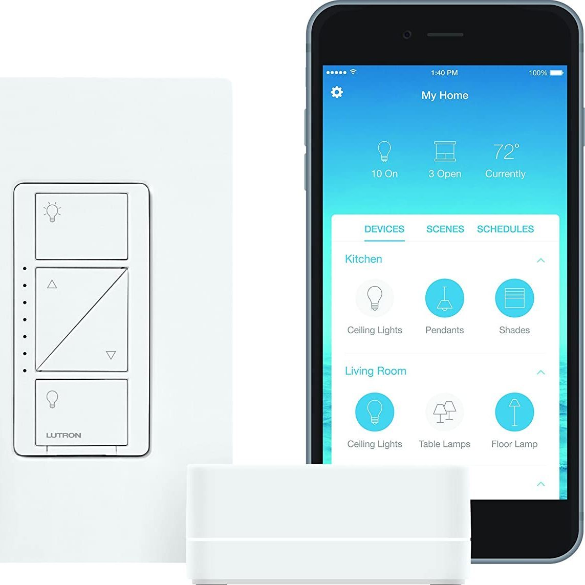This Caseta smart light switch starter kit by Lutron gives you easy and reliable control of your lights, shades and temperature from its free app. It provides superior dimming performance with LED bulbs and controls your lights from wherever you are in the house or garage. You can also set your lights to automatically adjust with the seasons so you and your family will always arrive to a well-lit home.
