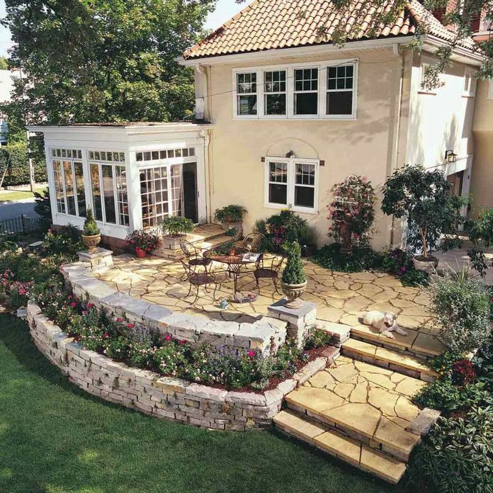 This patio, built on a slope, offers an area for entertainment, relaxing or enjoying the fire. It’s surrounded by a strong retaining wall that can double as additional seating.