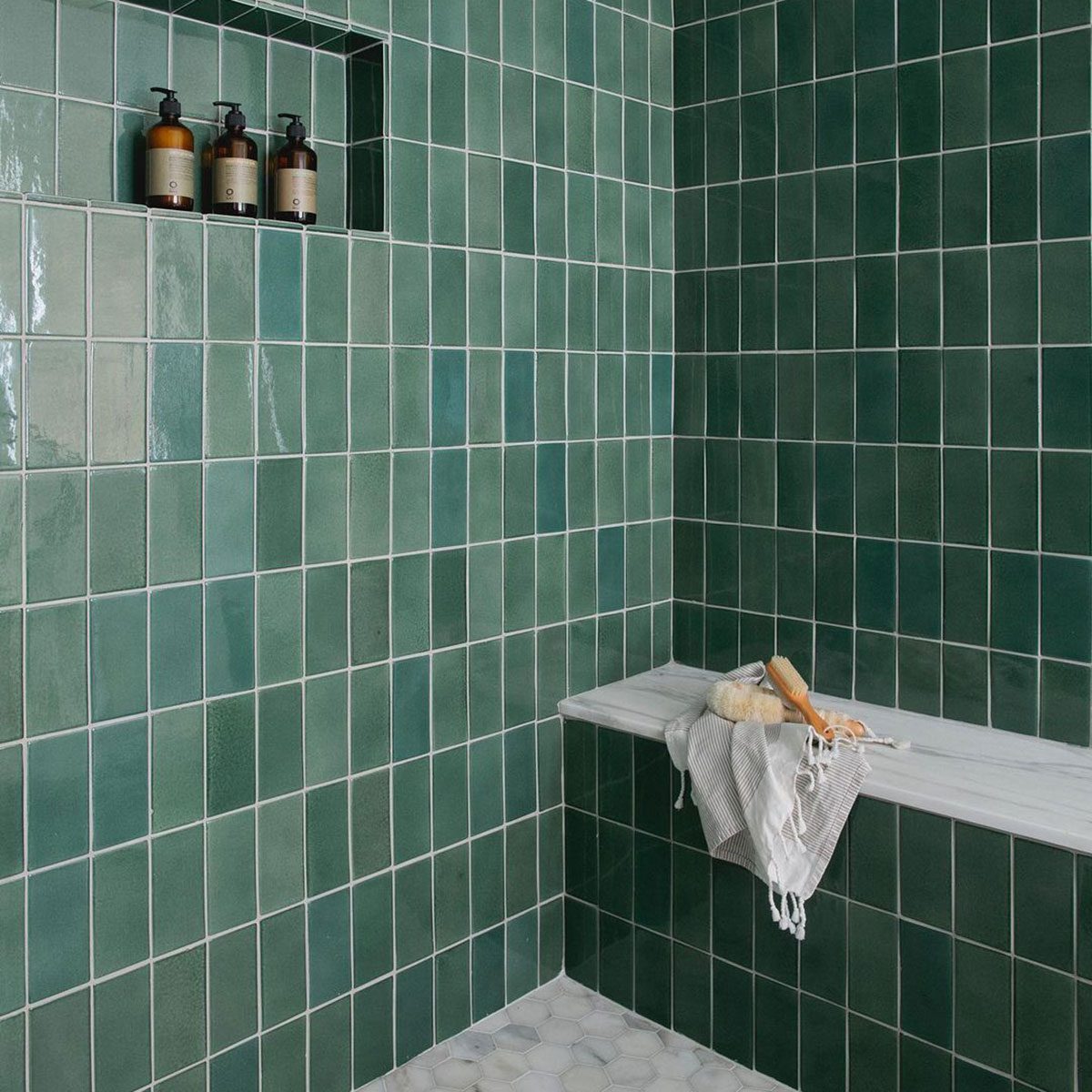 If this green tile shower from @adidstudio wasn’t stunning enough, the built-in bench adds another level of luxury.