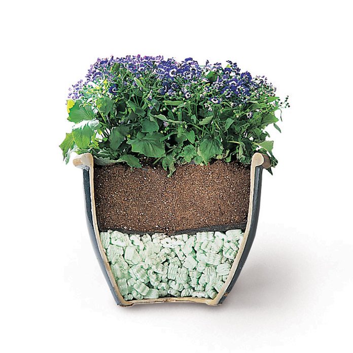 Name-brand potting mixes can set you back quite a few dollars when you’re filling large containers. Use less of the expensive soil mix (and save weight so you can move the containers more easily) by lining the bottom of large containers with packing peanuts before filling with soil mix. Put the packing peanuts in a sealed plastic bag or cover with landscape fabric to prevent them from mingling with the soil — a hassle if you ever dump the pot.