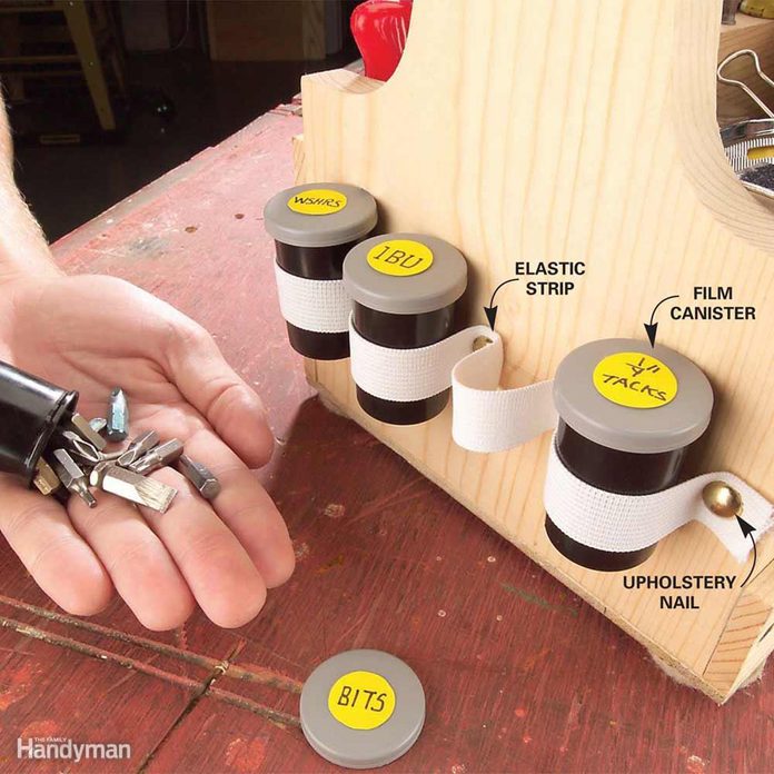 Store your itty-bitty screws, nails and driver bits in an easily accessible spot on your toolbox. Tack or screw a looped strip of 3/4-in. braided elastic (about $3 at a fabric store) to a convenient place and slide in loaded and labeled film canisters or pill containers.