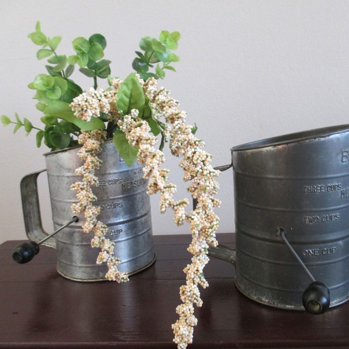 If you have an old flour sifter you no longer use, try turning into a planter. If you don’t have one, there’s a good chance you’ll find one at a thrift store or garage sale.