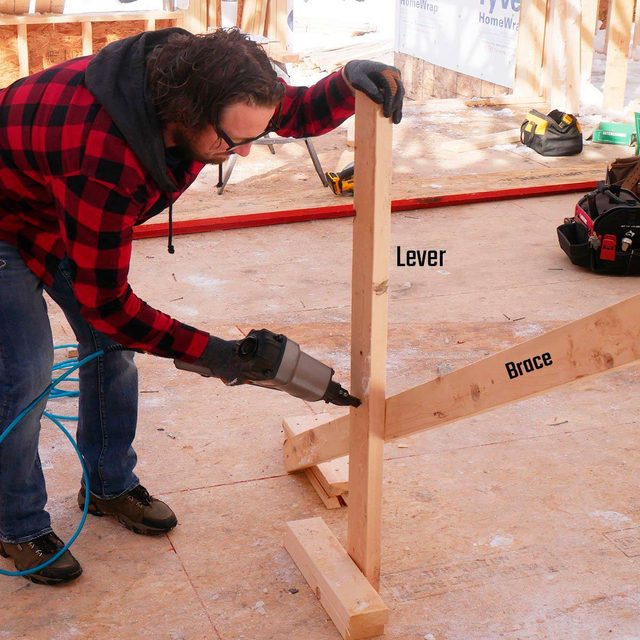 - Stack two anchor blocks to attach the brace to (nail to a floor joist/truss)