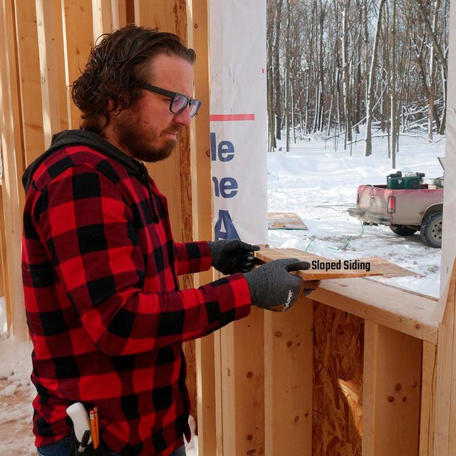 You could slope the sill itself, which requires cutting the cripples at a slight angle and causes the sill to protrude a bit on each side. Instead, rip down and install a tapered piece of weather resistant siding. We used cedar. Make sure to frame the rough openings a little larger to account for the width of the siding.