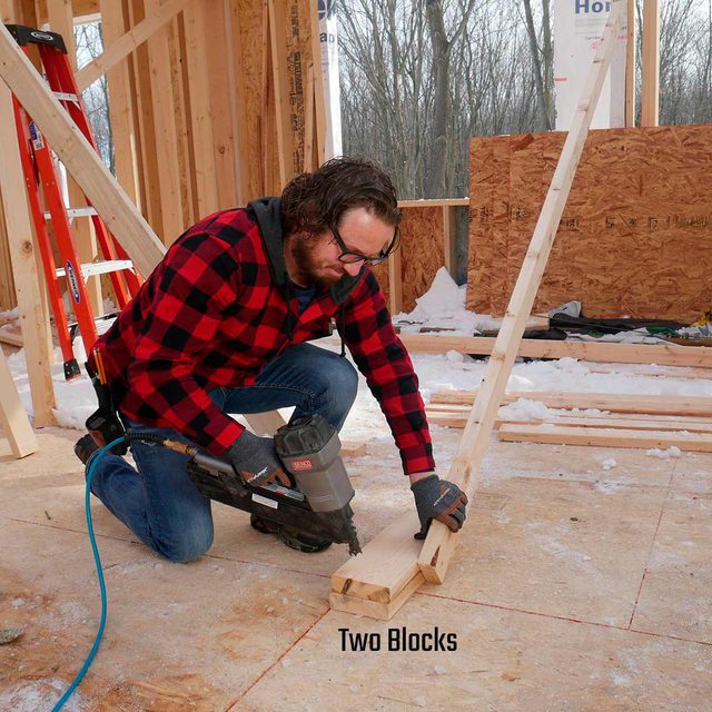 When installing blocking on a wall, it’s tempting to snap a line and keep all of the blocks on one plane. But don’t do it. Blocks are easier to install if you stagger them on either side of the line because you can fire the nails almost straight into the ends instead of angling them up or down. And if you think a straight line of blocks looks nicer (for the short time it’s visible), think again. Blocks will rarely be installed perfectly straight, but a staggered line tricks the eye and actually looks more uniform.